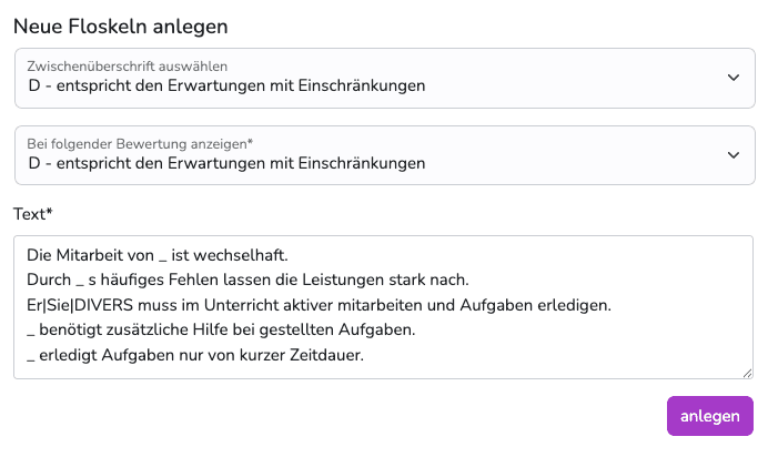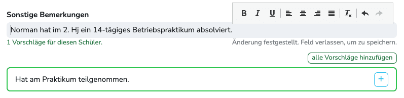 Für Arbeitsverhalten, Sozialverhalten, Arbeitsgemeinschaften, Berufsbildung, Interessen, Fähigkeiten, Fertigkeiten , sonstige Bemerkungen - kurz: alle denkbaren Felder auf Ihren Zeugnissen. (Sogar für normale Fächer)