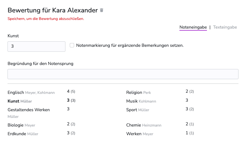 Schnell erstellte Unterrichte – egal ob im Klassenverband oder als Kurs. Mit einem Klick gelangen Sie in die Einzelfachansicht, um Bewertungen einzutragen. Und Sie sehen immer sofort, wo noch etwas zu tun ist.